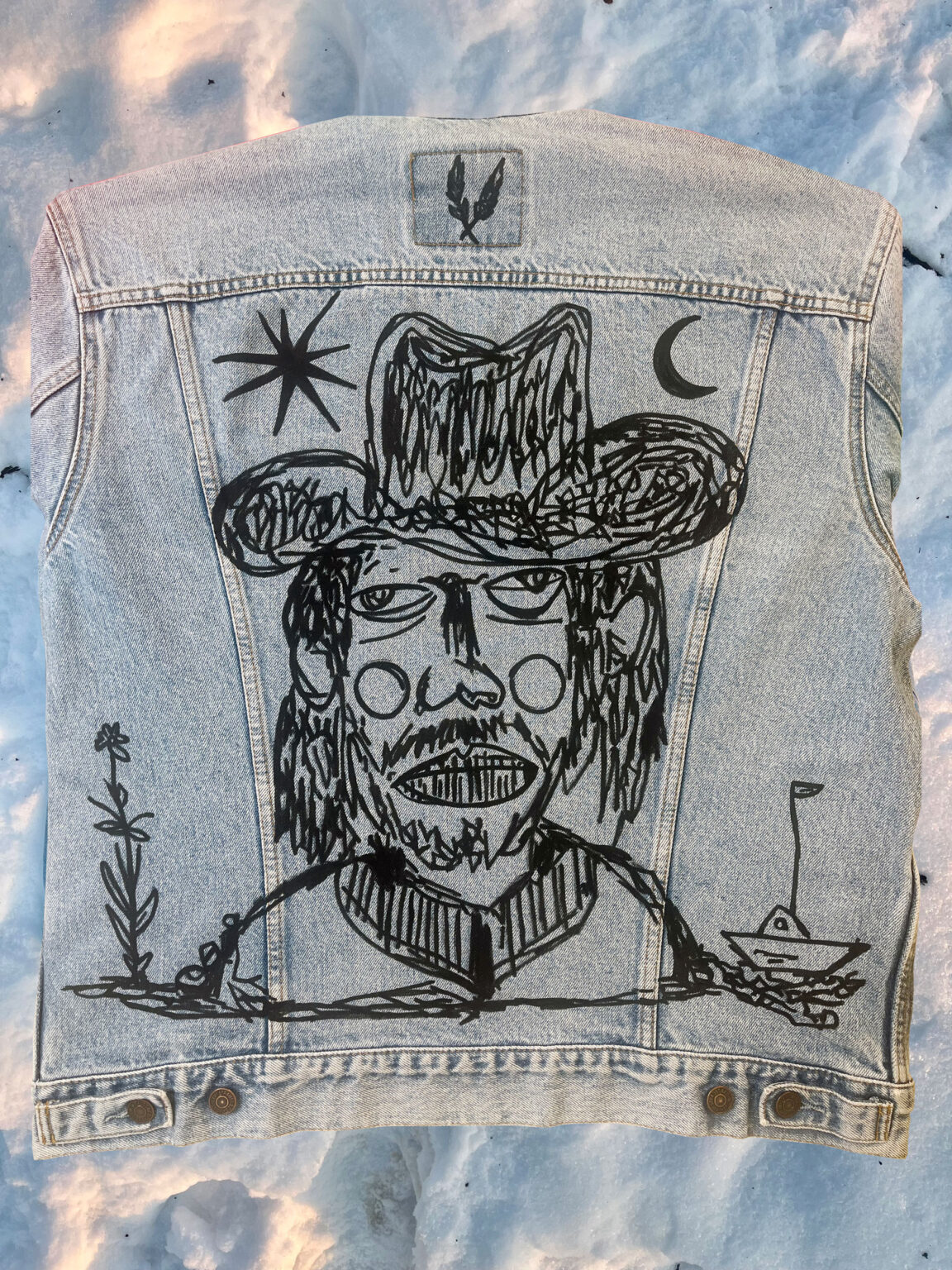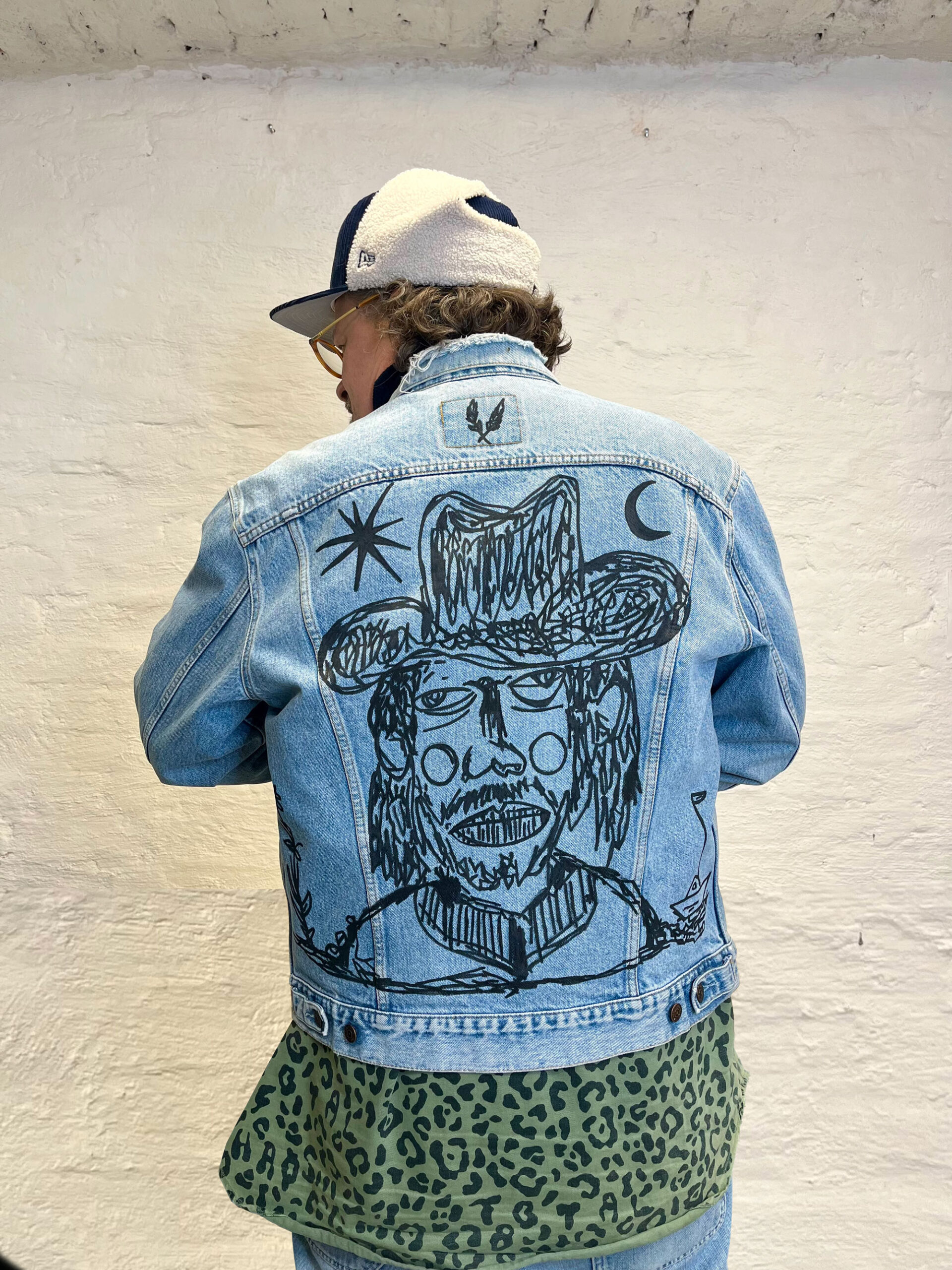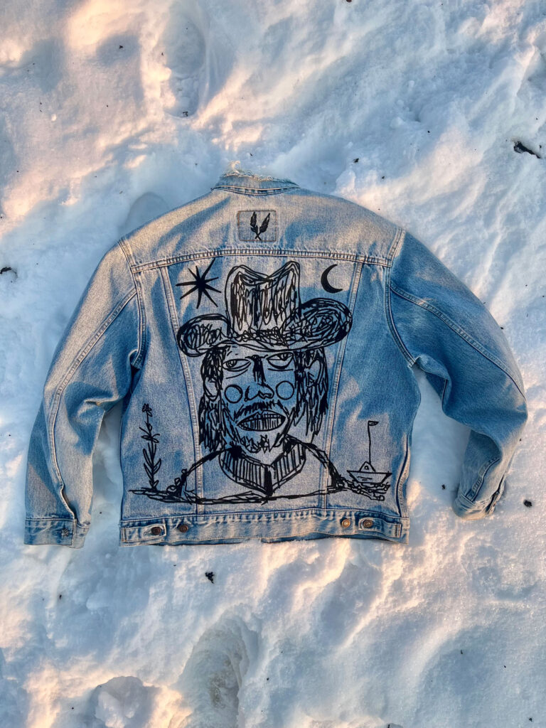 Private Comission / 2026 / Category Portifolio / Client Barrey / Year 2023 This hand-painted jacket was created with full artistic freedom, translating my exploration of symbolicfigures and narrative elements into a wearable, moving canvas. PREVSambaia /2025